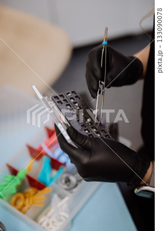 Orthodontic bracket kit with placement chart and tweezers, gloved hands, clinic closeup
