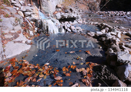 国指定天然記念物の湯沢噴泉塔脇の滝つぼ野湯
