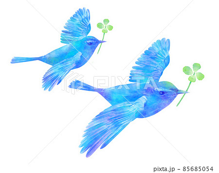 青い鳥と四つ葉のクローバー 水彩画風 手書き風