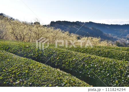 快晴の空と蠟梅と茶畑 神奈川