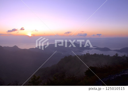 小豆島・四方指大観峰展望台より朝霧立ち込める朝陽と瀬戸内の多島美