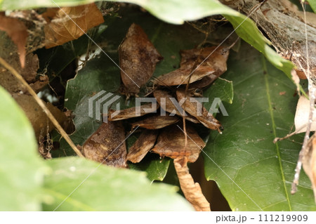生き物 昆虫 ムラサキツバメ、一月。アオキの葉の隙間に十頭ほどが越冬中