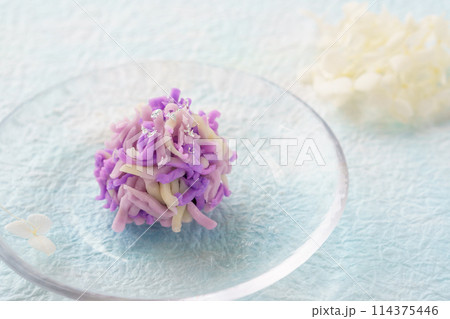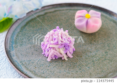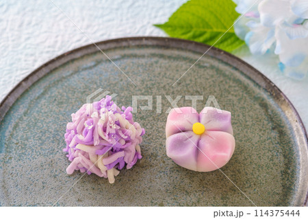 お皿の上の二つの和菓子「紫陽花」「四葩(よひら)」