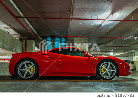 The side of Red Ferrari Sports Car parked in the parking lot. Selective focus.