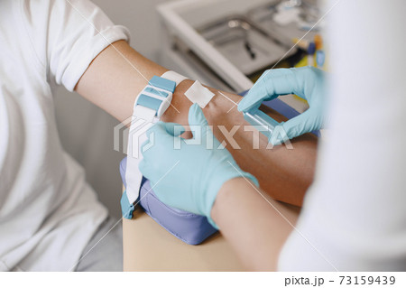 taking blood from a vein. clamping the vein with a disposable medical tourniquet. vein puncture with a sterile disposable needle. blood goes into a test tube for research in the laboratory