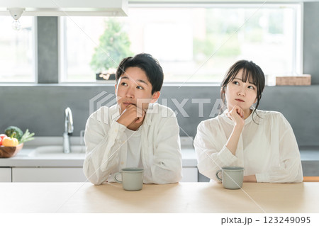 リビングで悩み・考える夫婦・カップル(悩む・回想・想像・将来・検討・計画)