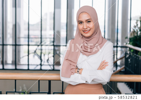 Young happy and successful South East Asian Islamic business woman with arms crossed in building