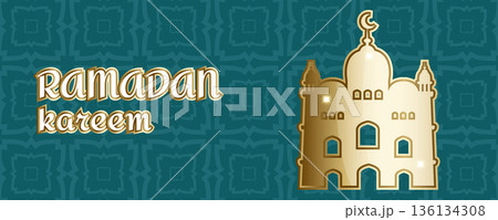 Ramadan Kareem greeting banner with golden mosque silhouette and Islamic geometric pattern, elegant Muslim holiday design
