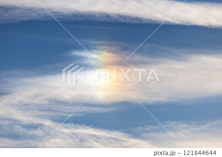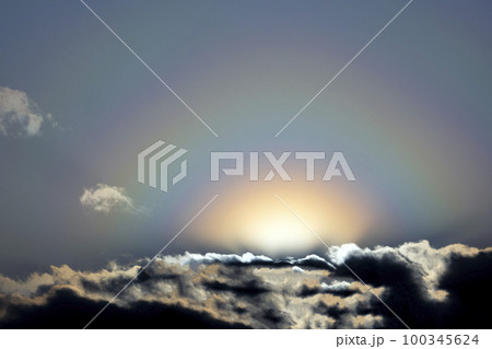 雲の上に虹のように架かる花粉光環と薄明光線(天使のはしご)