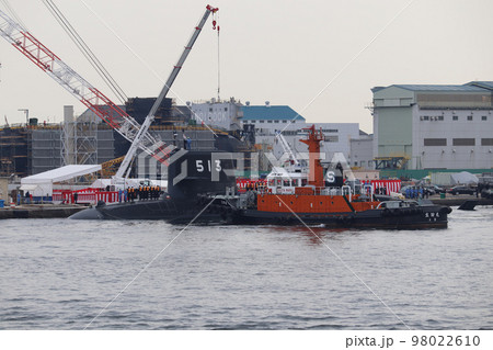造船所で働くタグボートと海上自衛隊の潜水艦たいげい