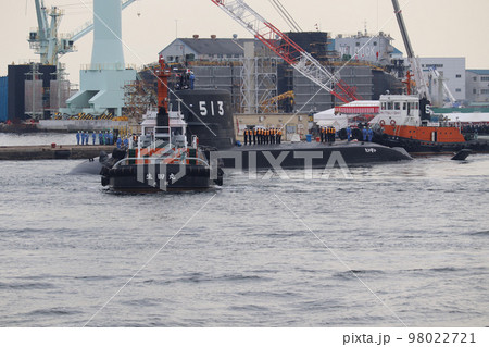 造船所を後にする潜水艦「たいげい」とタグボート