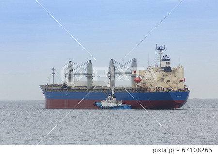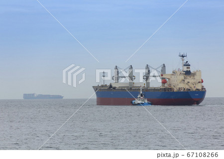 沖を行く貨物線とタグボート