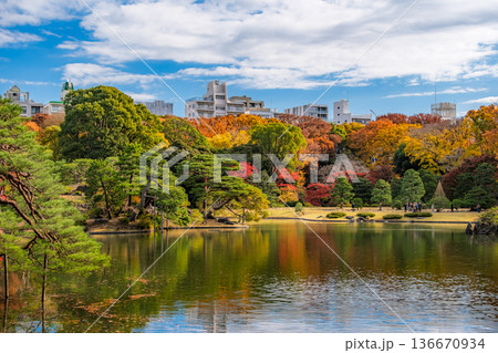 【東京都】快晴の浜離宮の紅葉と汐留高層ビル(浜離宮恩賜庭園)
