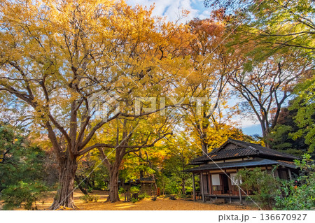 東京都文京区 秋晴れの青空に映える六義園の大イチョウと黄葉