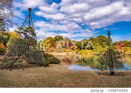 東京都文京区 秋晴れの六義園 藤代峠から見下ろす庭園全景と大泉水