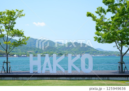 広島県因島のHAKKOパークにある文字モニュメントと瀬戸内海
