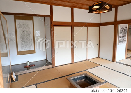 伝統的な囲炉裏(いろり)と床の間がある日本の古い民家