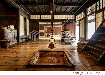 伝統的な囲炉裏(いろり)と床の間がある日本の古い民家