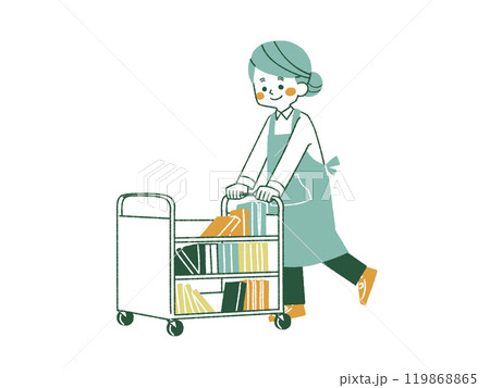 ブックトラックで本を運搬しているエプロンを着用した女性-4色
