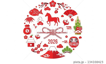 2026年の干支モチーフと和柄アイコンを円形に配置した年賀デザイン