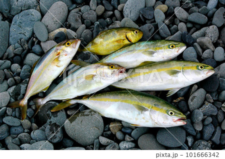 カンパチの若魚を釣って、浜の玉石の上に寝かせて撮った