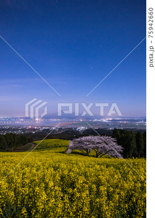《長崎県 白木峰高原》月光下の満開の桜と菜の花