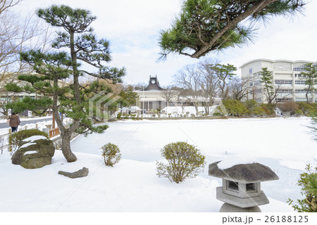 2013年(平成25年)9月1日閉館を迎えた旧平野政吉美術館と真っ白な雪化粧をした大手門の堀の松