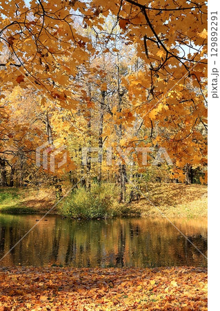 October autumn park in Russia, lake with red leaves and reflection in the lake, Aleksandrovsky park, Tsarskoe Selo, Leningrad region. Autumn landscape, seasons.