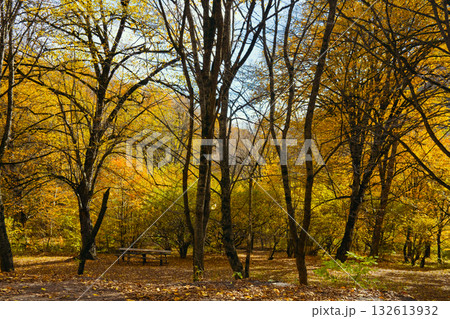 Autumn park in October on a sunny day, lake with red maple leaves and oaks, background. Beautiful bright natural landscape in the park, seasons, golden autumn season, invitation to walk, selective