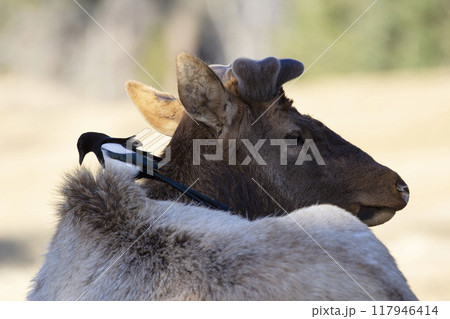 Black-billed magpie is sitting on a young laying Wapiti elk with velvet little antlers and picking insects.