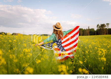Young woman with american flag on blooming meadow. Independence Day. USA flag fluttering in the wind