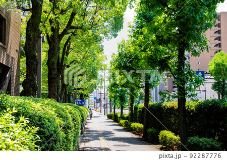 広島市役所沿いの緑の歩道風景です。緑が鮮やかなトンネルのようです。市役所から東方面を展望。広島県