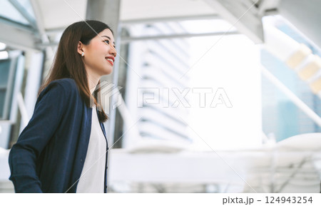 Portrait of successful business asian woman standing looking forward at outdoors in city