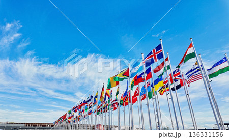 笑顔で並ぶ多国籍の人々と国旗イメージ
