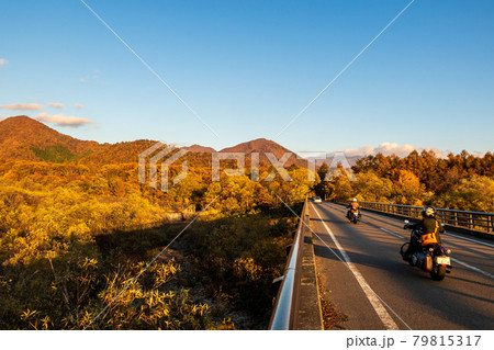 紅葉の磐梯山ゴールドラインを行くバイク