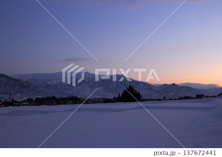 冬の夕暮れの田園地帯(新潟県南魚沼市)