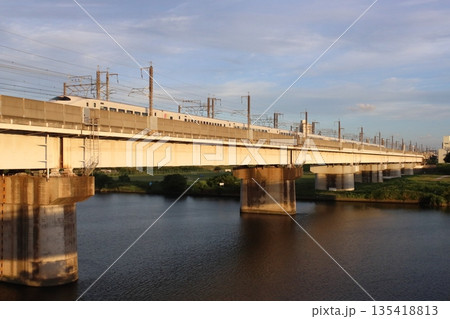 夕暮れの戸田橋を行く東北新幹線(埼玉県戸田市)