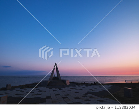 早春の宗谷岬 夜明けの日本最北端の地の碑と間宮林蔵の立像
