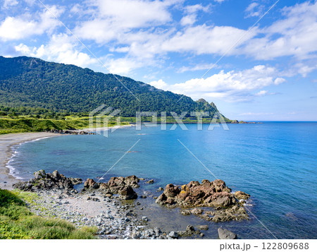 北海道稚内市 宗谷湾の砂浜と利尻富士
