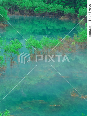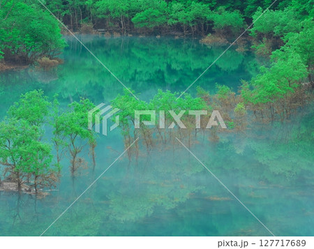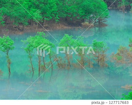 新緑の秋田県秋扇湖 水鏡の水没林が望める新玉川大橋