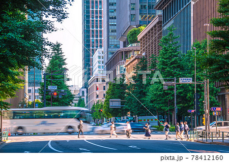 日本の東京都市景観 新緑に映える「大手町駅前」などのオフィスビル群を望む(奥は丸の内)