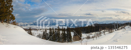 スキー場から一望する魚沼盆地と巻機山や八海山などの雪山パノラマ (新潟県、南魚沼、上越国際スキー場)