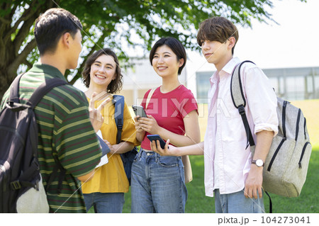 教育イメージ 大学 休み時間に雑談する学生 男性・女性