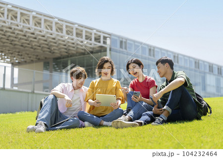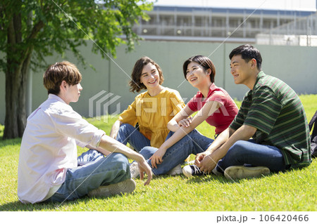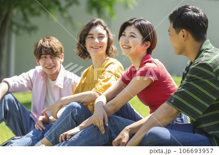 教育イメージ 大学 休み時間に雑談する学生 男性・女性