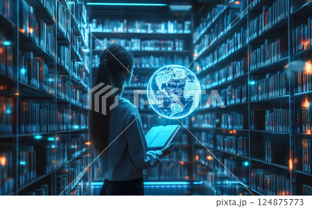 A woman interacts with a holographic globe while standing in a library. The concept of global knowledge and futuristic education. Generative AI.