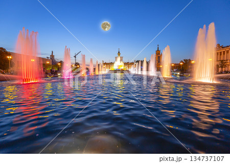 Fountain Stone Flower (at night with the super moon) at VDNKh in Moscow. VDNKh (called also All-Russian Exhibition Center) is a permanent general-purpose trade show in Moscow, Russia