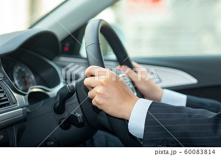両手がハンドルを握りながら運転するイメージ。安全運転。