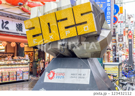 Promotion stand advertising Osaka World Expo in 2025 in Dotonbori district of Osaka, Japan
