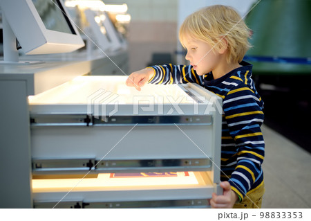 Little caucasian boy is looking an exposition in a scientific museum. Keen child is exploring of exhibits. Education and entertainment for children. Activities for family with kids.