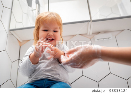 Smiling little girl learns to wash her hands together with her mother. The mother holds out her hands in foam to the baby. Bedtime hygiene procedures